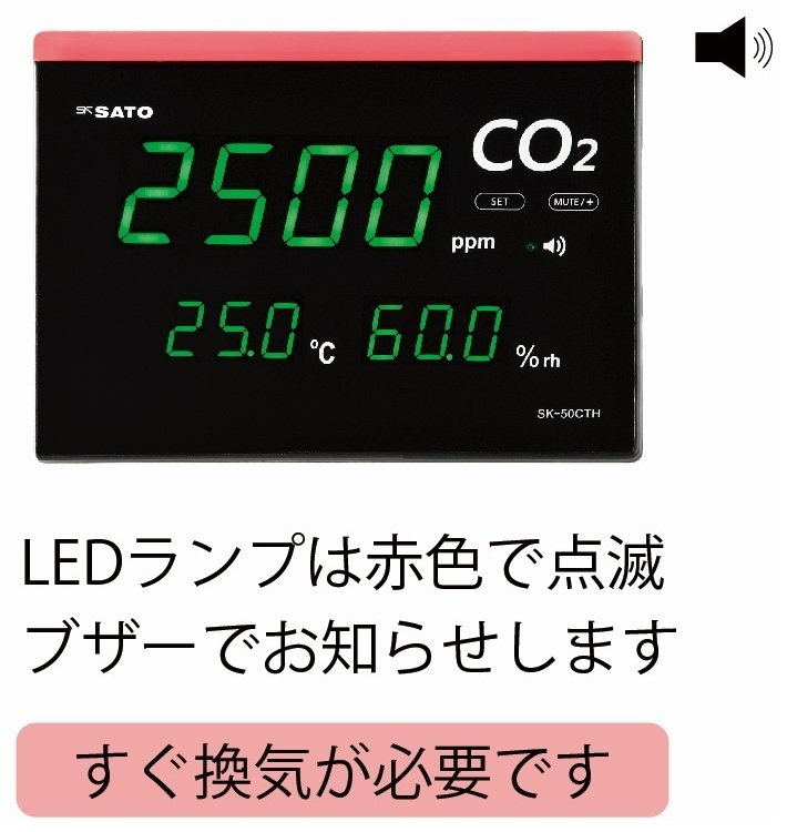 CO2濃度に応じて、LEDランプが3段階に変化し、ブザーを鳴らします。